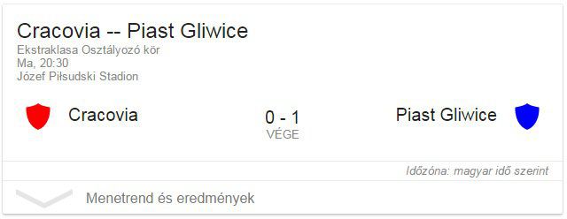 KS Cracovia - Piast Gliwice (Pontos végeredmény: 0-1, 1-0) Odds: 4,7 Nyert